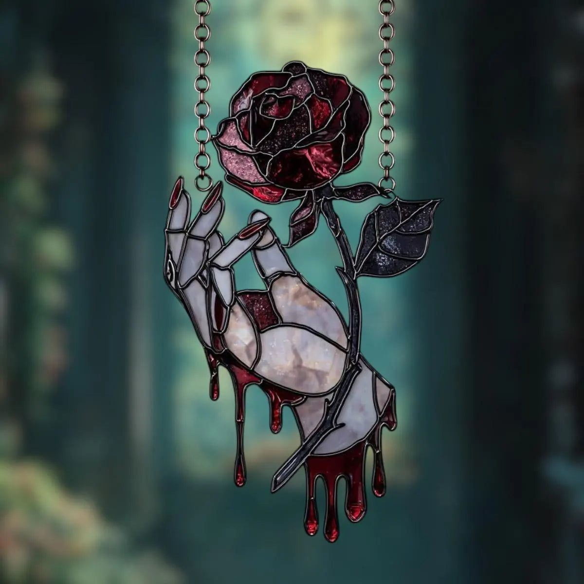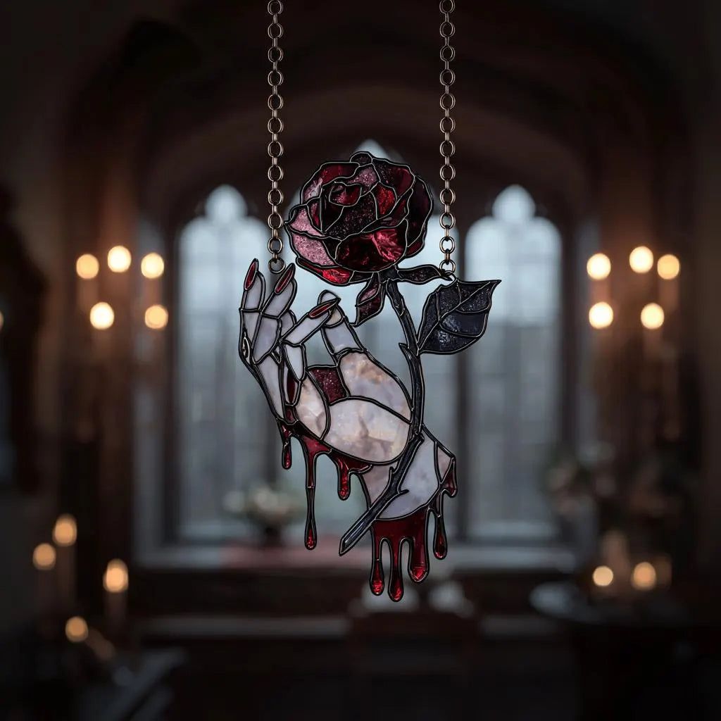 Gothic Bloody Rose Hand Acrylic Suncatcher - Faux Stained Glass Window Hanging, Gothic Vampire Decor, Unique Gift For Dark Romance Lovers