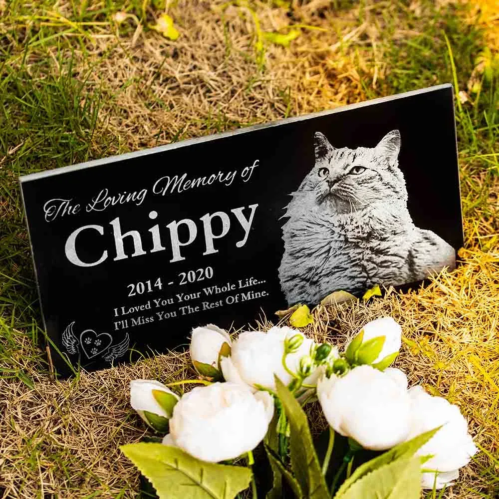 Personalized pet portrait memorial tombstones, pet death memorials, and condolence gifts for pet lovers and owners.