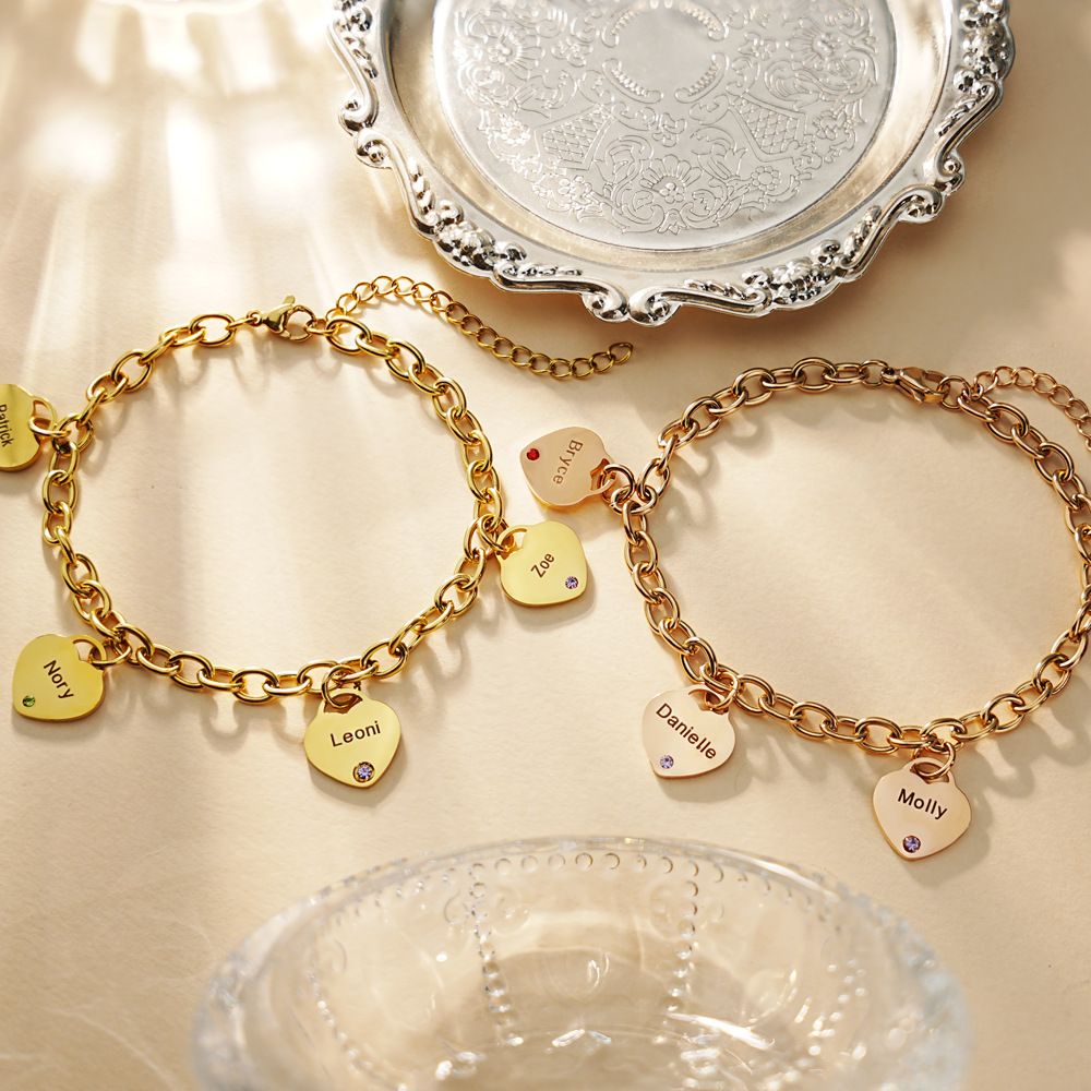 Birthstone Name Bracelet, Personalized Heart Charm Birthstone Name Bracelet, Engraved Birthstone Bracelet, Christmas Gift