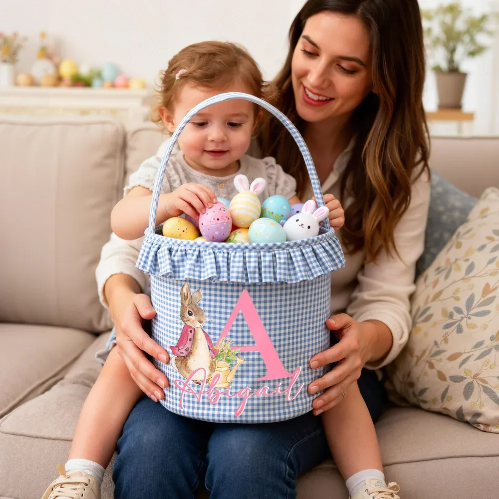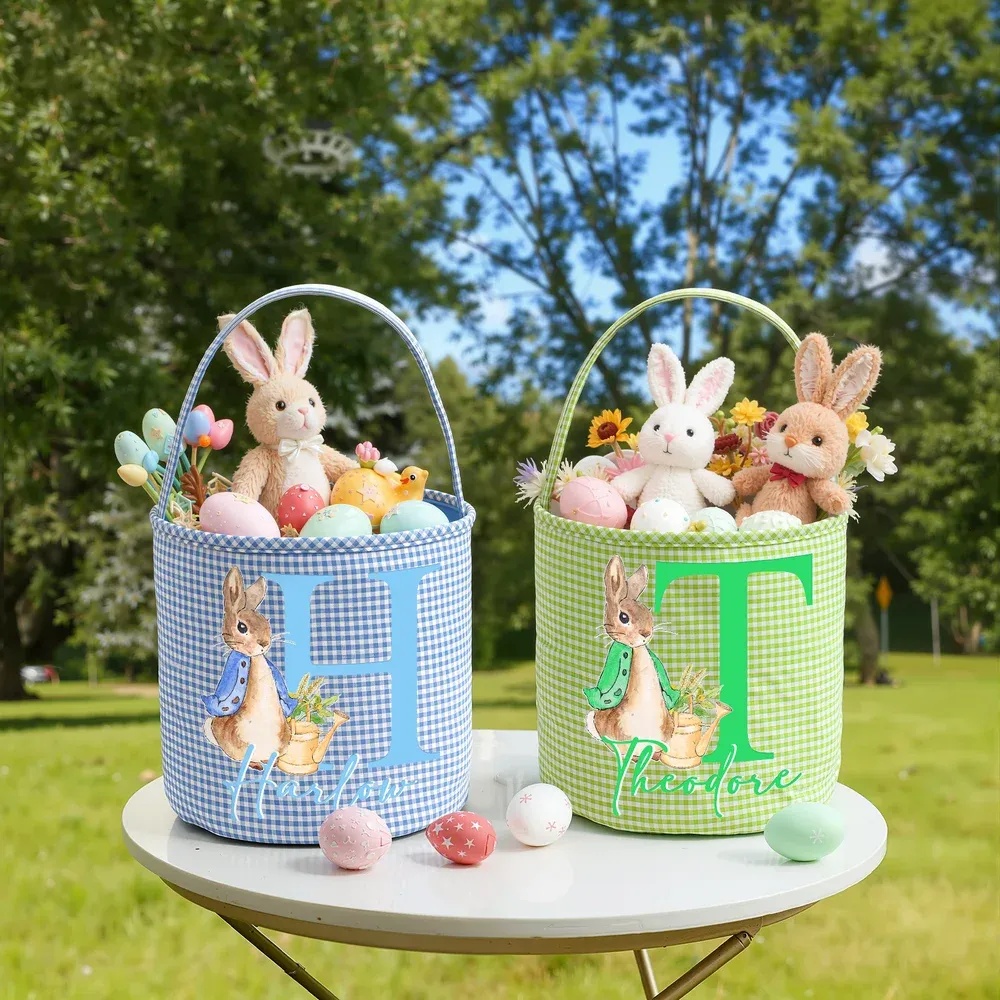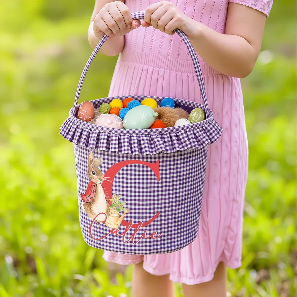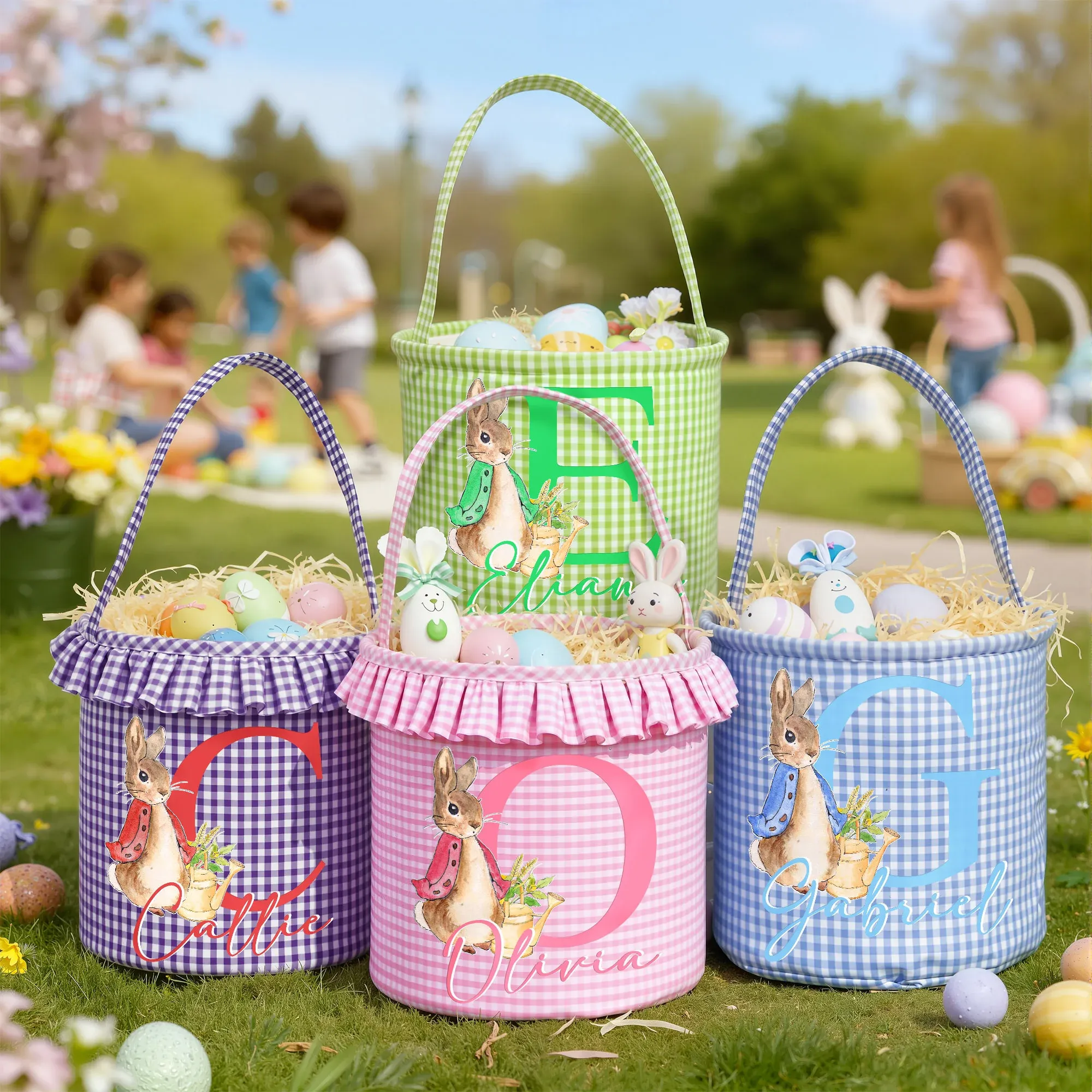 Personalized Multi-Color Cute Bunny Rabbit Large Capacity Plaid Easter Basket with Name and Initial Easter Egg Hunting Party Gift for Kids